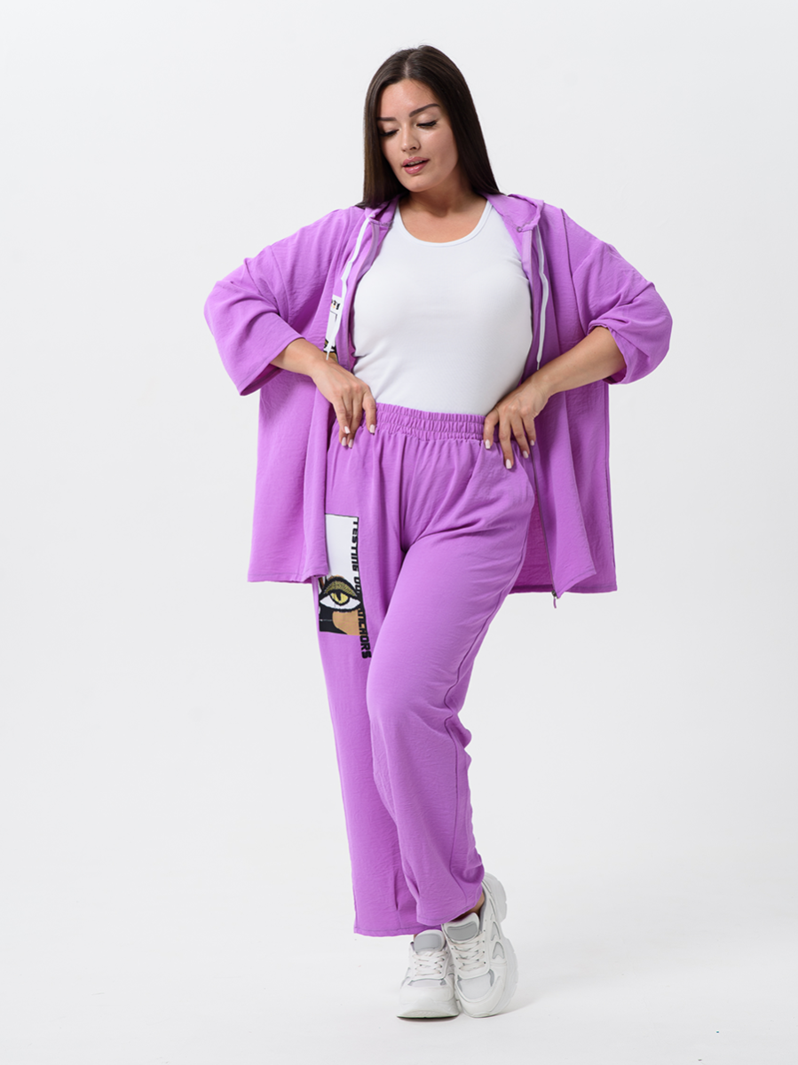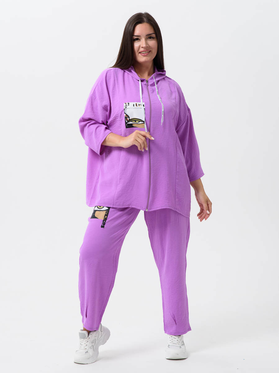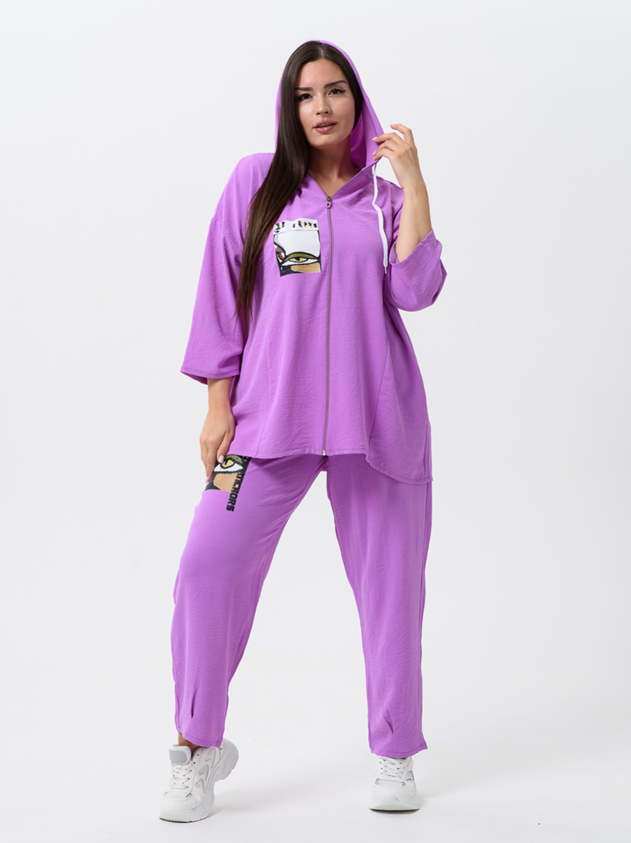 Женский стильный костюм из легкой ткани - сингапур - самое то для жаркого лета. Вверх изделия - удлинненый оверсайз кофточка на молнии с капюшоном, рукава спущенные - длина до запястья (длина рукава указана от горловины). Низ - свободные брюки с карманами, пояс на резинке, снизу имеется защипка, которая слегка заужает штаны. Костюм декорирован принтом. Свободный и стильный, не сковывает движения. Двойка на каждый день в приятных расцветках - хорошая находка для вашего гардероба!