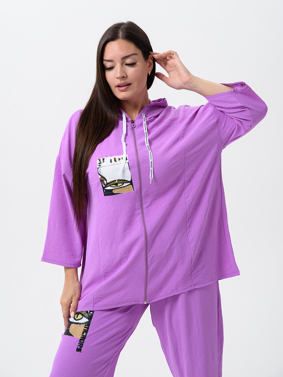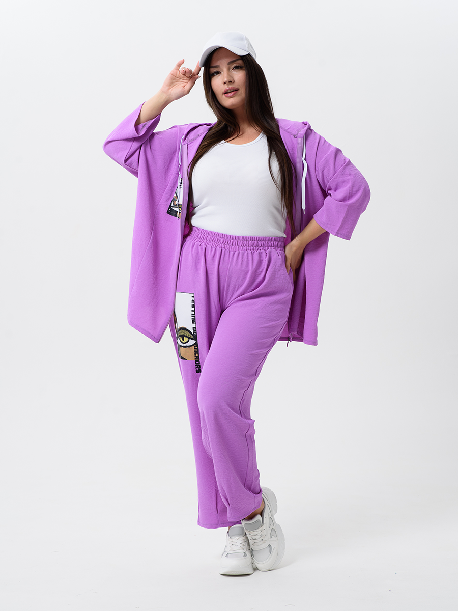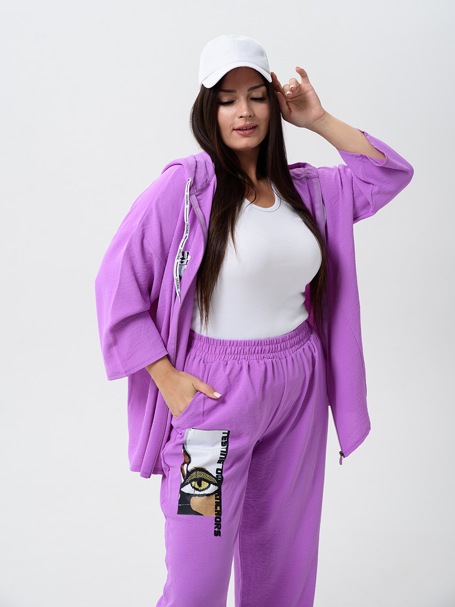 Женский стильный костюм из легкой ткани - сингапур - самое то для жаркого лета. Вверх изделия - удлинненый оверсайз кофточка на молнии с капюшоном, рукава спущенные - длина до запястья (длина рукава указана от горловины). Низ - свободные брюки с карманами, пояс на резинке, снизу имеется защипка, которая слегка заужает штаны. Костюм декорирован принтом. Свободный и стильный, не сковывает движения. Двойка на каждый день в приятных расцветках - хорошая находка для вашего гардероба!