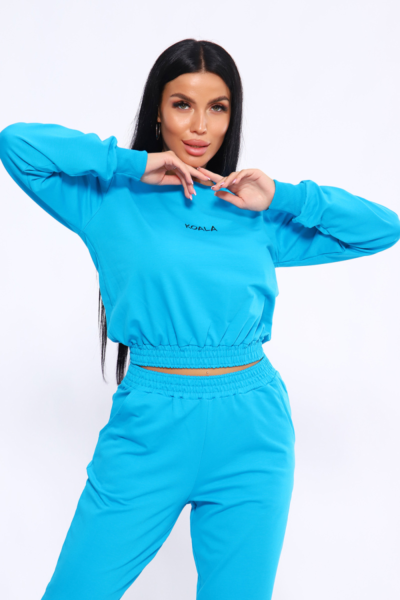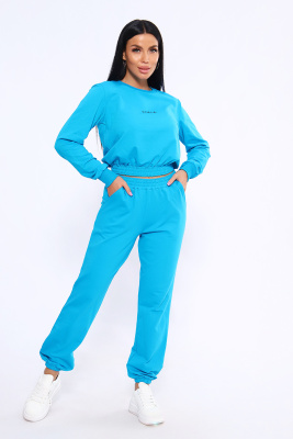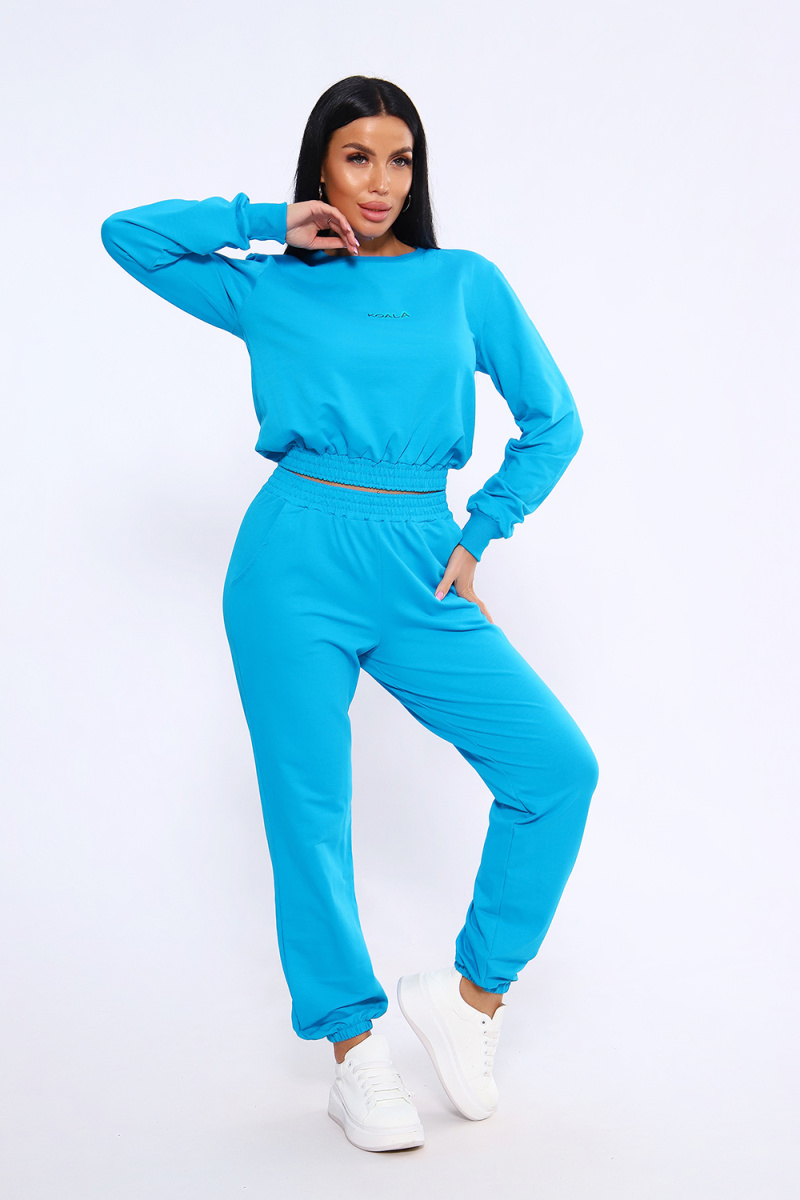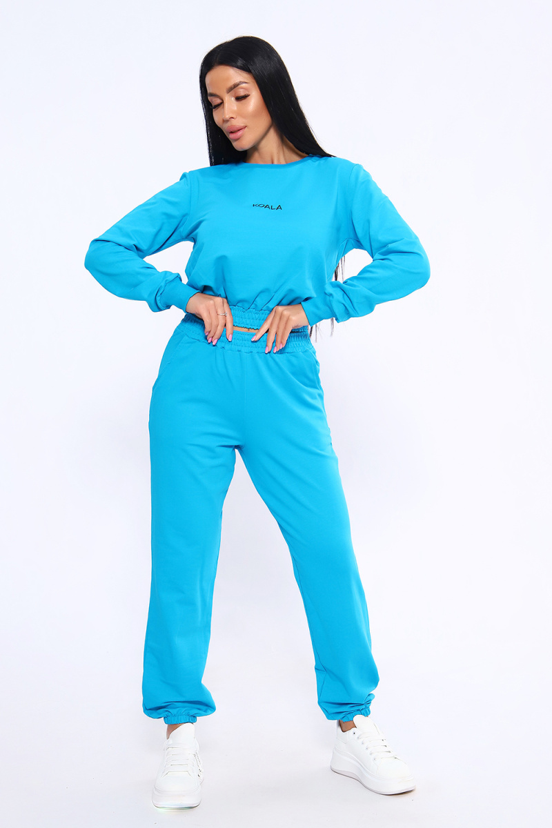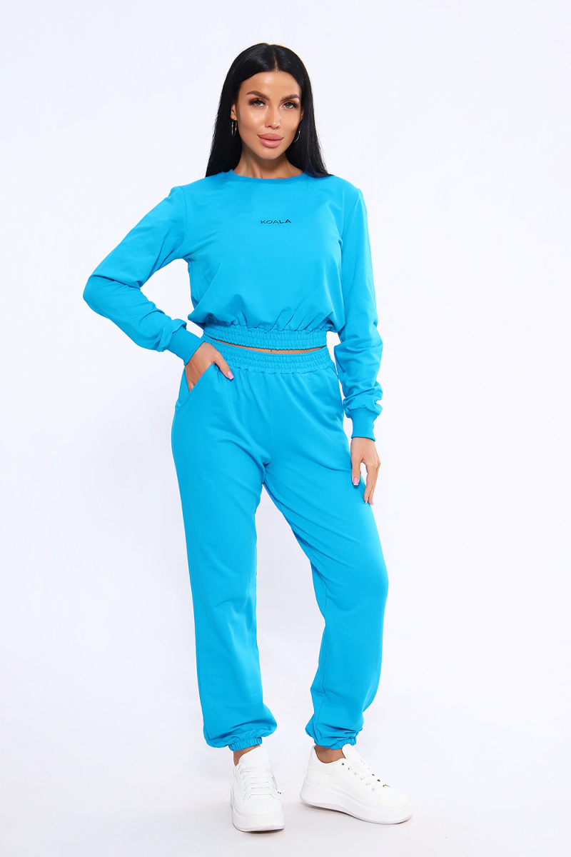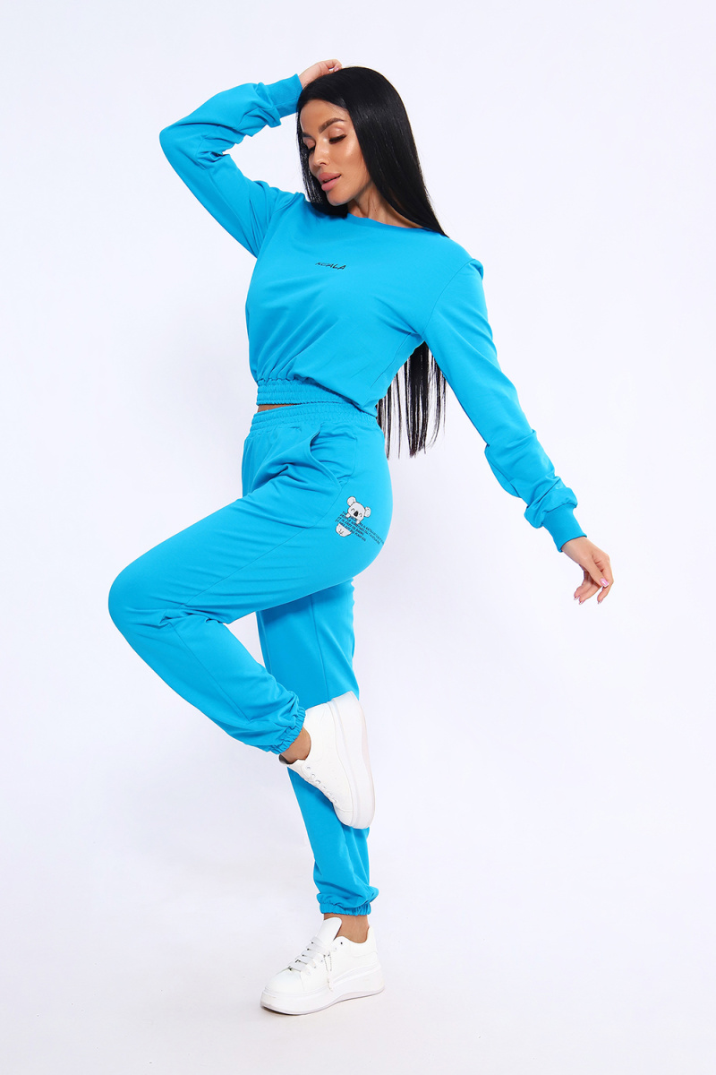 Костюм женский для повседневной носки. Данная модель выполнена из трикотажного полотна футер 2х нитка с лайкрой. Толстовка с втачным рукавом. На полочке присутствует маленьким принт. Манжеты на рукавах и горловина выполнены из эластичного трикотажного полотна кашкорсе. Пояс на толстовке и брюках выполнены из основной ткани под поясную машинку (отделочная тройная строчка). Брюки имеют по бокам карманы, принт на задней детали. По низу брюк вшита резинка 2,5 см.